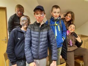 Nejdříve se trochu zmalovaly, dostaly svítící tyčinky a výprava mohla začít. Na noční stezce byly připraveny různé nástrahy, překážky a překvapení. Děti měly za úkol přinést z každého stanoviště barevný balónek, abychom měli jistotu, že prošly celou trasu. Závěrečný úsek už nebyl nijak označen a děti se sami musely dostat na začátek trasy. Někteří jedinci sice trochu bloudili, nakonec tu stezku ale všichni zvládli.